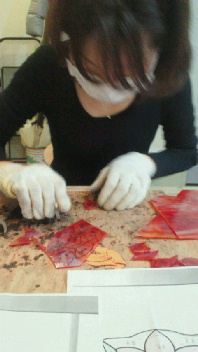 投稿日: 投稿者: eclatstdg生徒さんの制作風景(アンちゃん) 2月23日土曜日です。雪がちらついて今日も寒い一日。アンちゃんはランプ制作2回目です。 ガラスを選んで切っていきます。ポインセチアのお花。どの部分のガラス使おうかな。だいぶ切れてきましたね^^