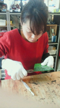 投稿日: 投稿者: eclatstdg生徒さんの制作風景(アンちゃん) アンちゃん、ランプ制作復帰です^^ グリーンのガラスを切ってます。 お掃除しながら^^ 4面ランプのすべてのガラスがカットできました^^見て~ 次回はルーターあてていきましょう!!