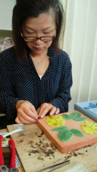 モザイク2枚目です。テラコッタの上にガラスをはりつけていきます。