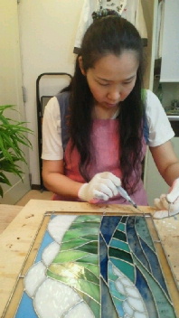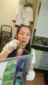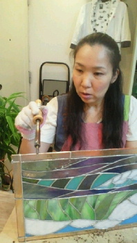 投稿日: 投稿者: eclatstdg生徒さんの制作風景(恭ちゃん) 恭ちゃん、「ダイヤモンドヘッド」のパネルの仕上げに入っていきます。 でも、その前に~「気になるハンダをきれいにしたい」と頑張っておられました^^ そして、真鍮のフレームをつけて、ハンダ付け。 次回、磨いて染めて、完成です!!