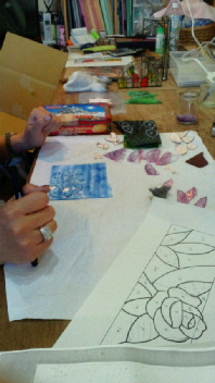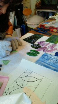 投稿日: 投稿者: eclatstdg生徒さんの制作風景(F森さん) F森さん、今日は「バラのティッシュボックス」のガラスを選んで切っていきます。 「さて、どんな風に切っていこうかしら」 小さなピースが多いですが、失敗もなく^^花びらと葉っぱが切れましたね!