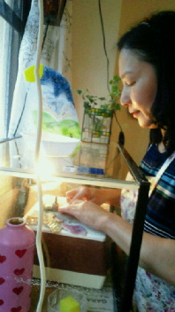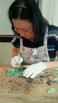 葉っぱのガラスを切ってます。