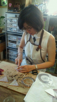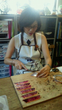 投稿日: 投稿者: eclatstdg生徒さんの制作風景(おーちゃん) 三連休最後のお休みの日です。 今日もいいお天気。 おーちゃん、土曜日に引き続き今日もステンドに来てくれました!! 「時計」の制作です。 今日はひたすらテープ巻。 とっても丁寧にきれいにテープが巻けました^^