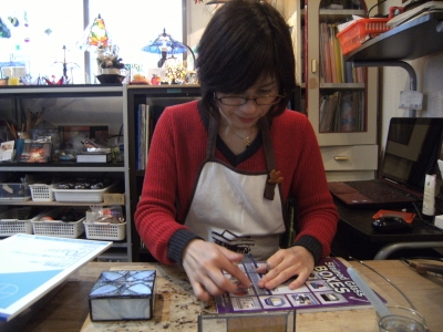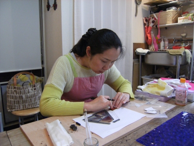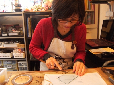 おーちゃんはメモスタンドの仕切りにするガラスを切って