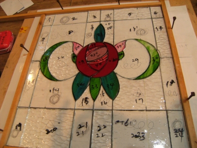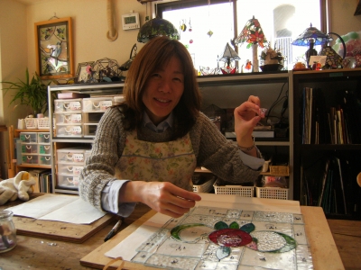 かとちゃんは「バラのパネル」のガラスを微調整。