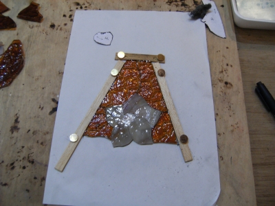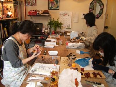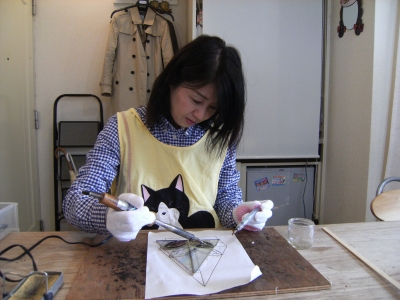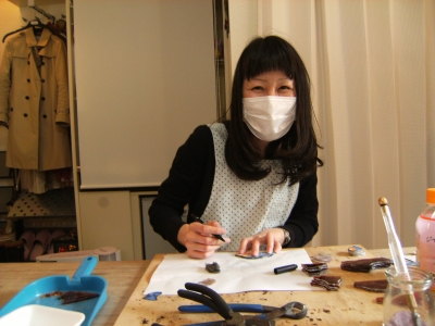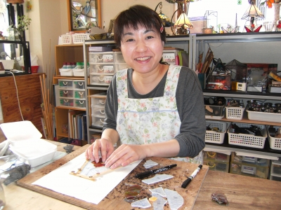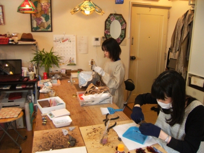 K本さん、お花のミニランプ、残りのガラスをカットしてルーターで微調整。