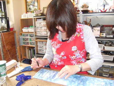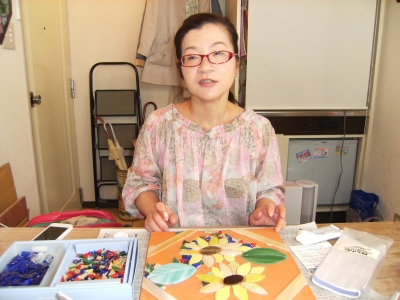 おたかさん、せっせとモザイクのガラスピースを