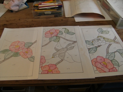 投稿日: 投稿者: eclatstdg教室の風景:ランプ お盆明け、久しぶりの教室です。 F森さんとM永さんが来られました! M永さんは前回に制作されたパネルとおそろいの ランプを制作中です。 F森さん、椿と鳥の行燈ランプの制作に入りました! 色を塗ってイメージがわいてきましたね^^