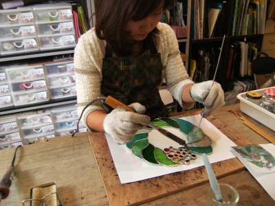 デザインはご自分でされ、ガラスの上にレースの飾りバンドを