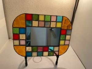 残りガラスをスクエアに細かくカット、上手く繋ぎ合わせてとってもおしゃれでポップなミラーです。