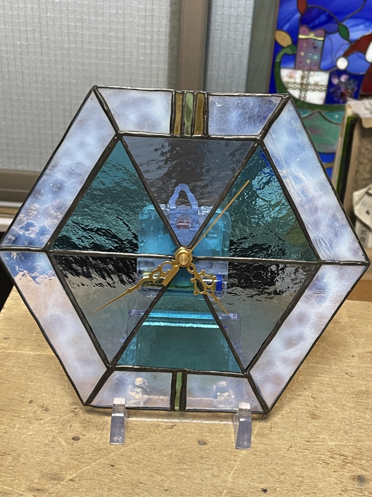 投稿日: 生徒様の作品:時計 R3.12.19 O.keさんの「時計」が完成しました! ブルー系と周囲はブルザイのホワイト、 寒色系なのでポイントにアンバーを入れられました。ご自宅のブルーのカーテンに合わせたお色です!ガラスカット、慣れて来られましたね!