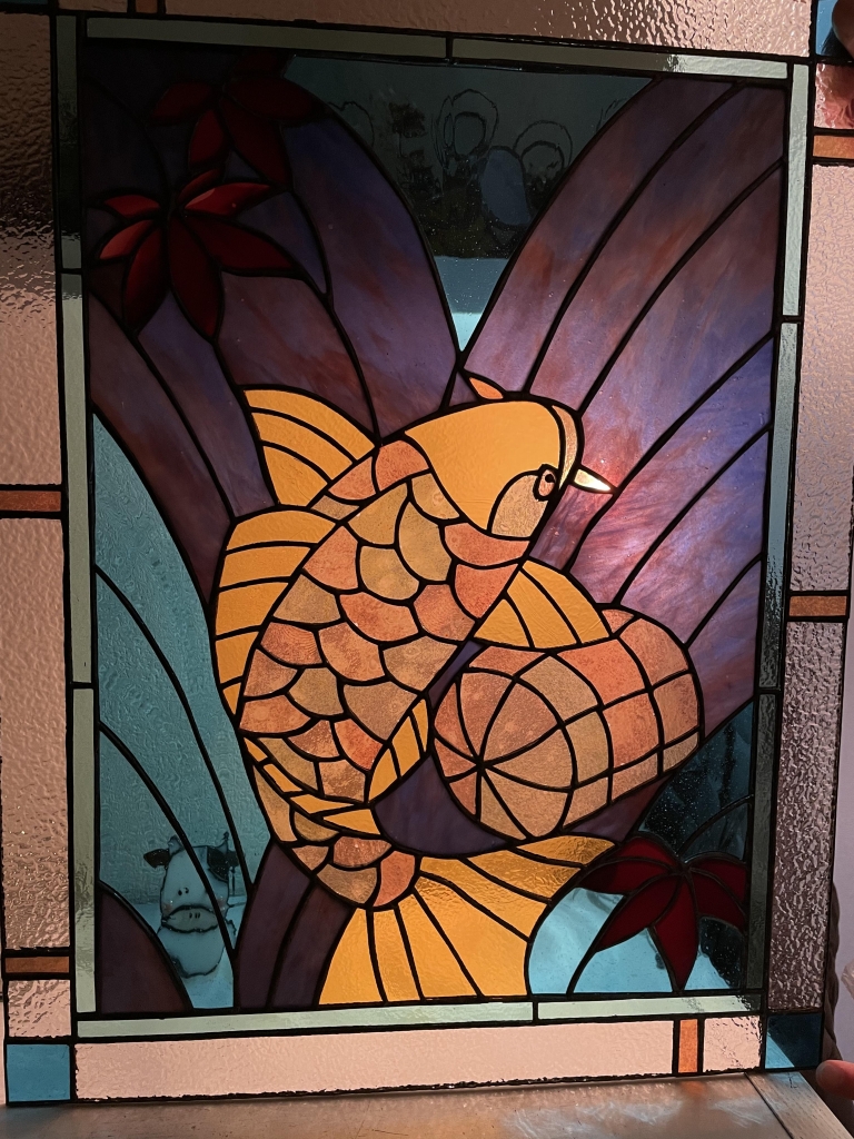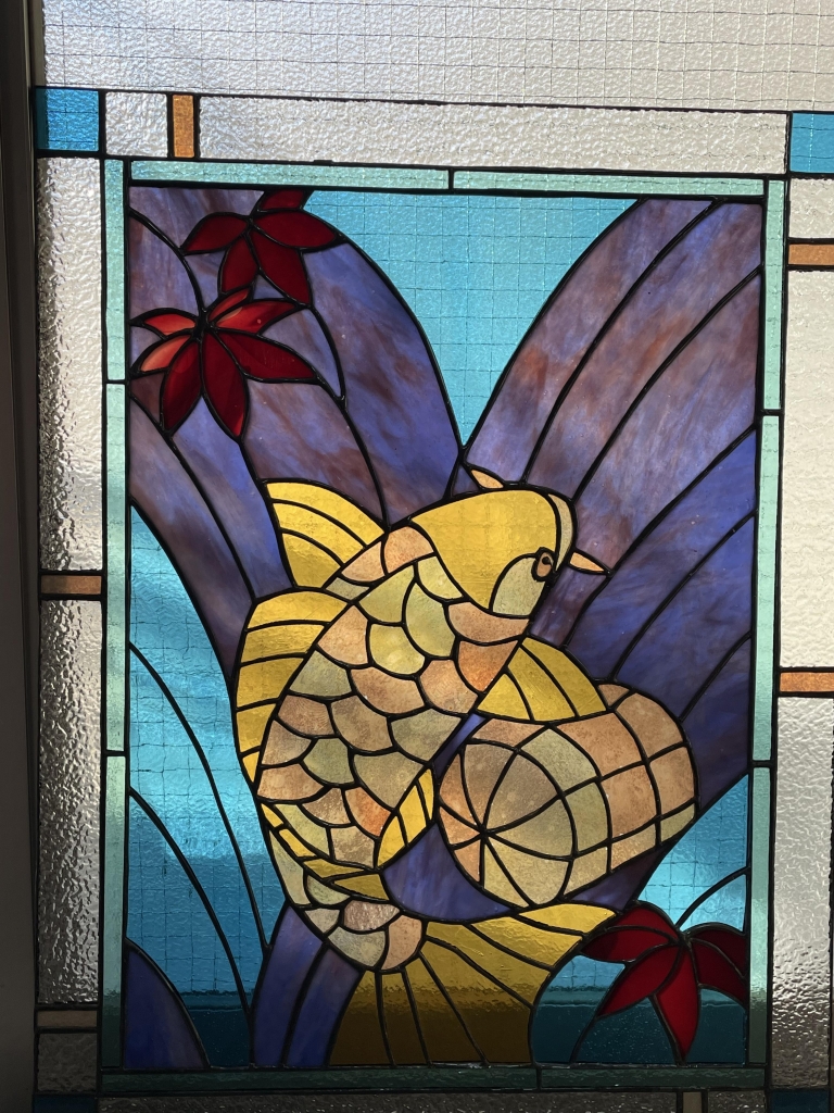 k.fさんの「鯉の滝登りと俵」のパネルが完成しました!鯉に使用したガラスはブルザイのラスターゴールド、何とも豪華です!