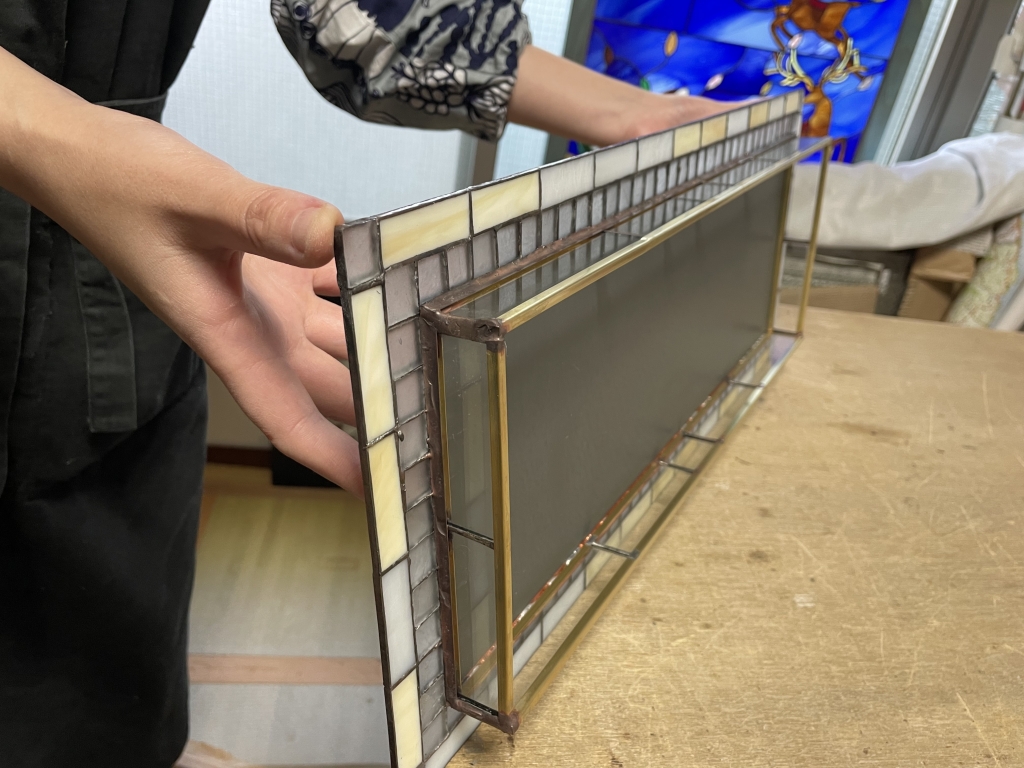 モザイク風に四角いガラスを繋げて、アンティークパティーナで染められました。