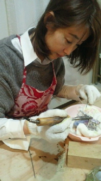 ガラスカットの練習から。Oさんは体験2回目。