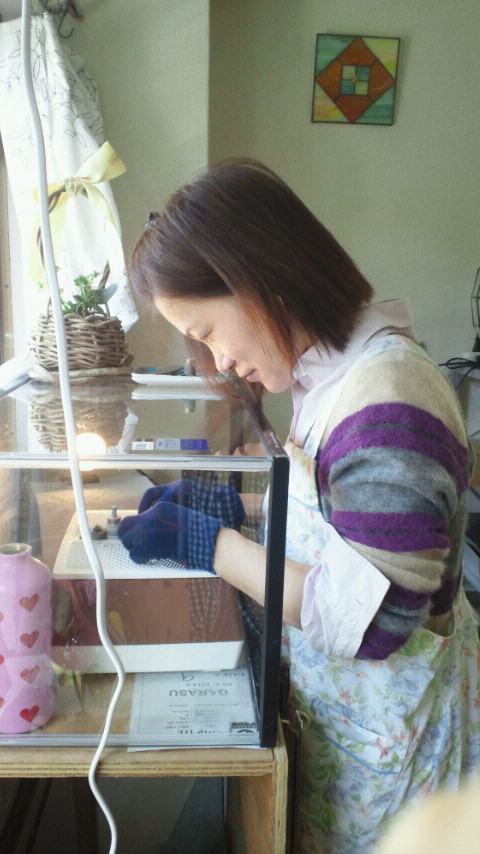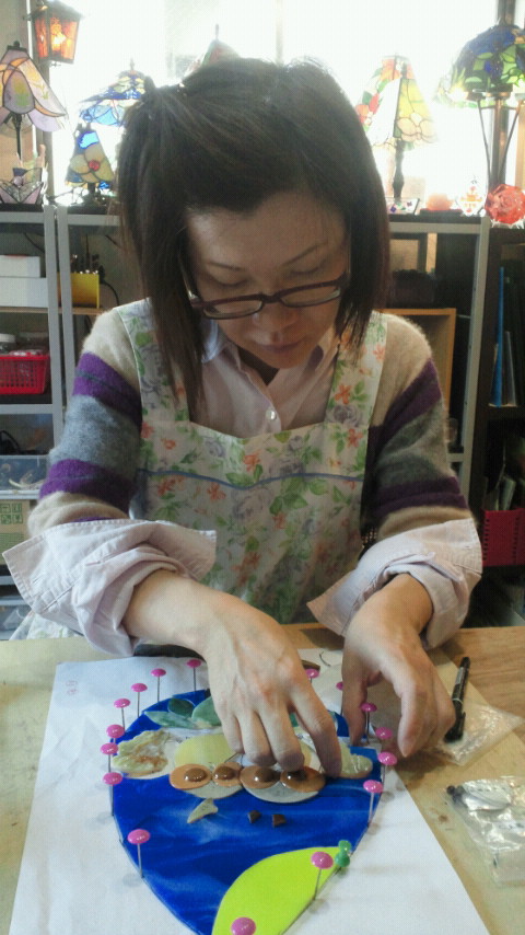 今日もおたかさんは「フクロウ」のパネルのガラスをルーターで削って整える作業です。