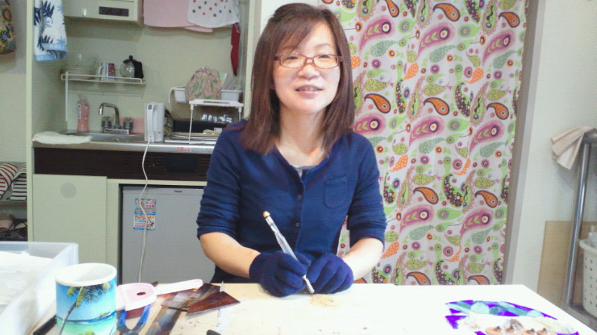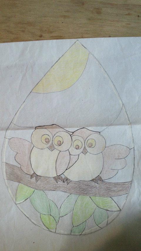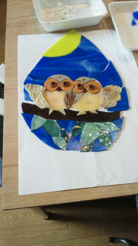 投稿日: 生徒さんの制作風景(おたかさん) おたかさんの2作目は「ふくろう」のパネルに挑戦です! 型紙を切ったあと、ガラスを選び、順調にカットされてました。 フクロウの羽の部分のガラスが波打ってて難しい。。 全部切れたよ~!!